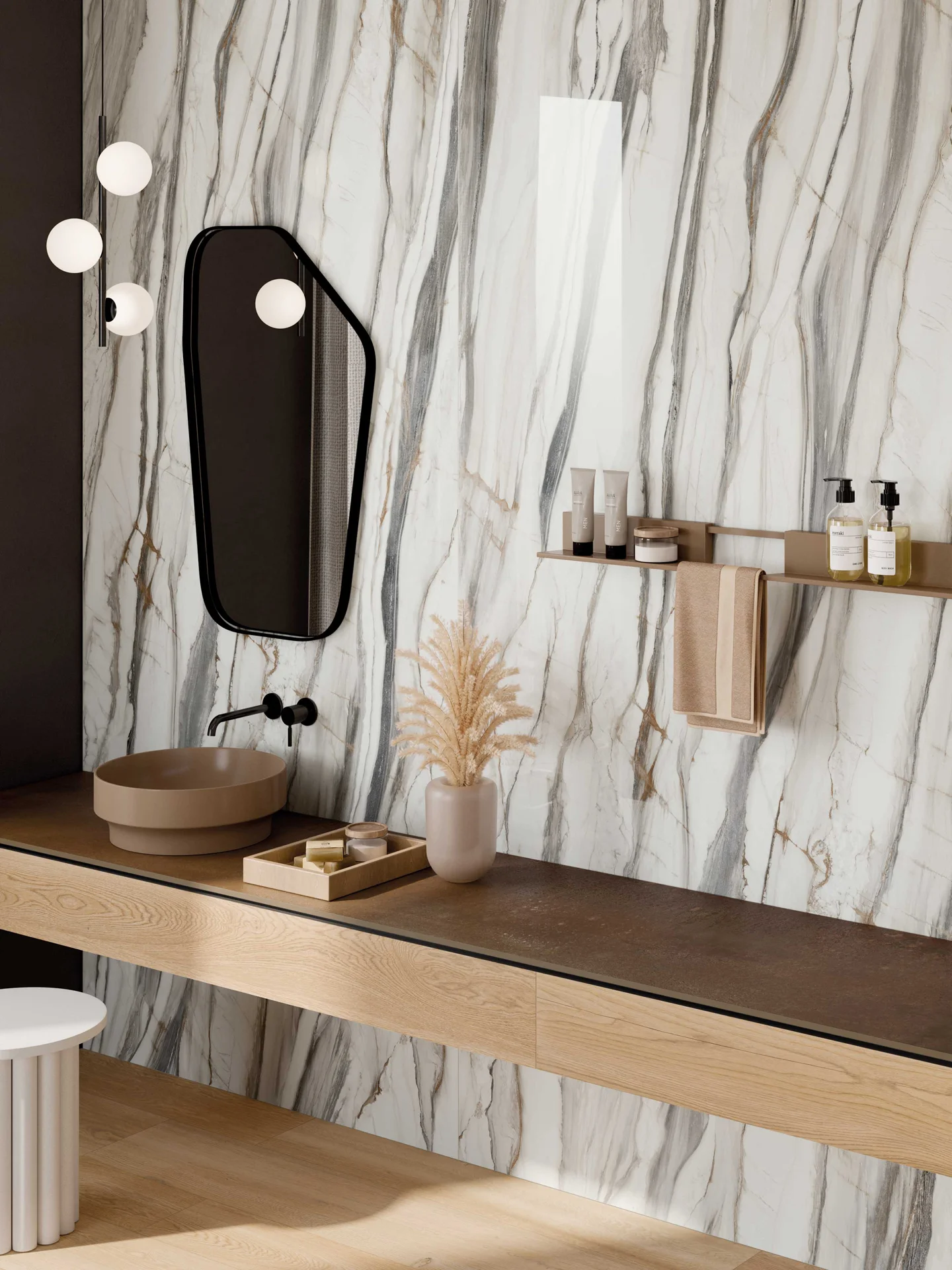 In de aanloop naar uw afspraak in de showroom vragen wij u om de afmetingen van uw sanitaire ruimte. Dan gaat ons team direct aan de slag. We zetten uw ruimte alvast klaar in ons 3D-tekenprogramma. In de tussentijd kunt u op onze inspiratiepagina's wegdromen terwijl u zoekt naar uw favoriete materialen en designs.