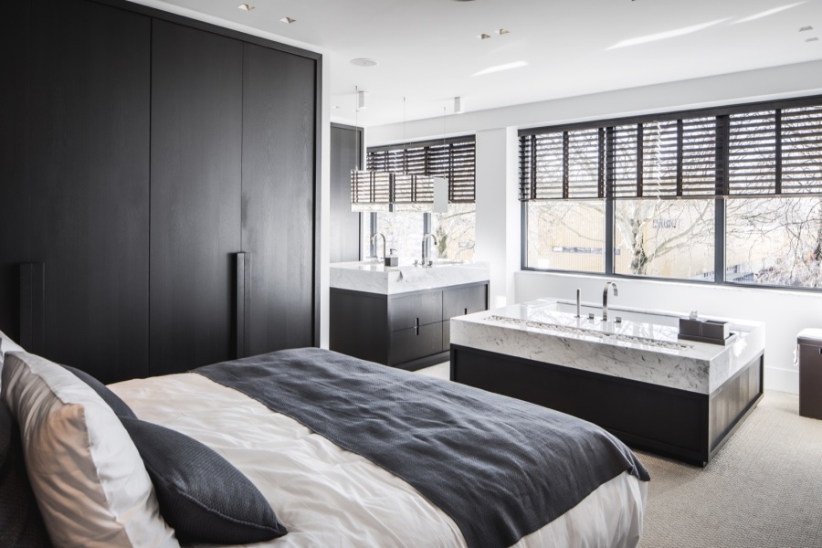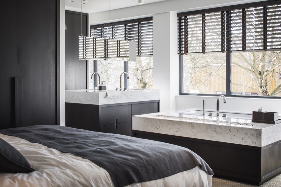 Stel je een rustige plek voor waar je dagelijks kunt ontspannen en tot rust kunt komen. In deze omgeving gaan een stijlvolle slaapkamer en een verfijnde badkamer naadloos in elkaar over, met comfort en elegantie als uitgangspunten. De kranen van Dornbracht's MEM collectie vormen het hart van deze harmonie.