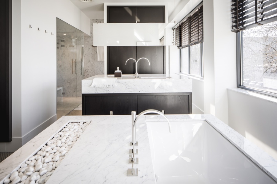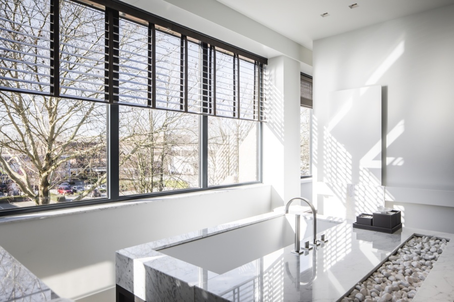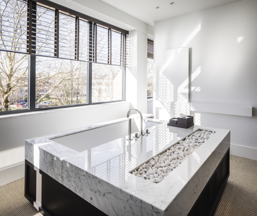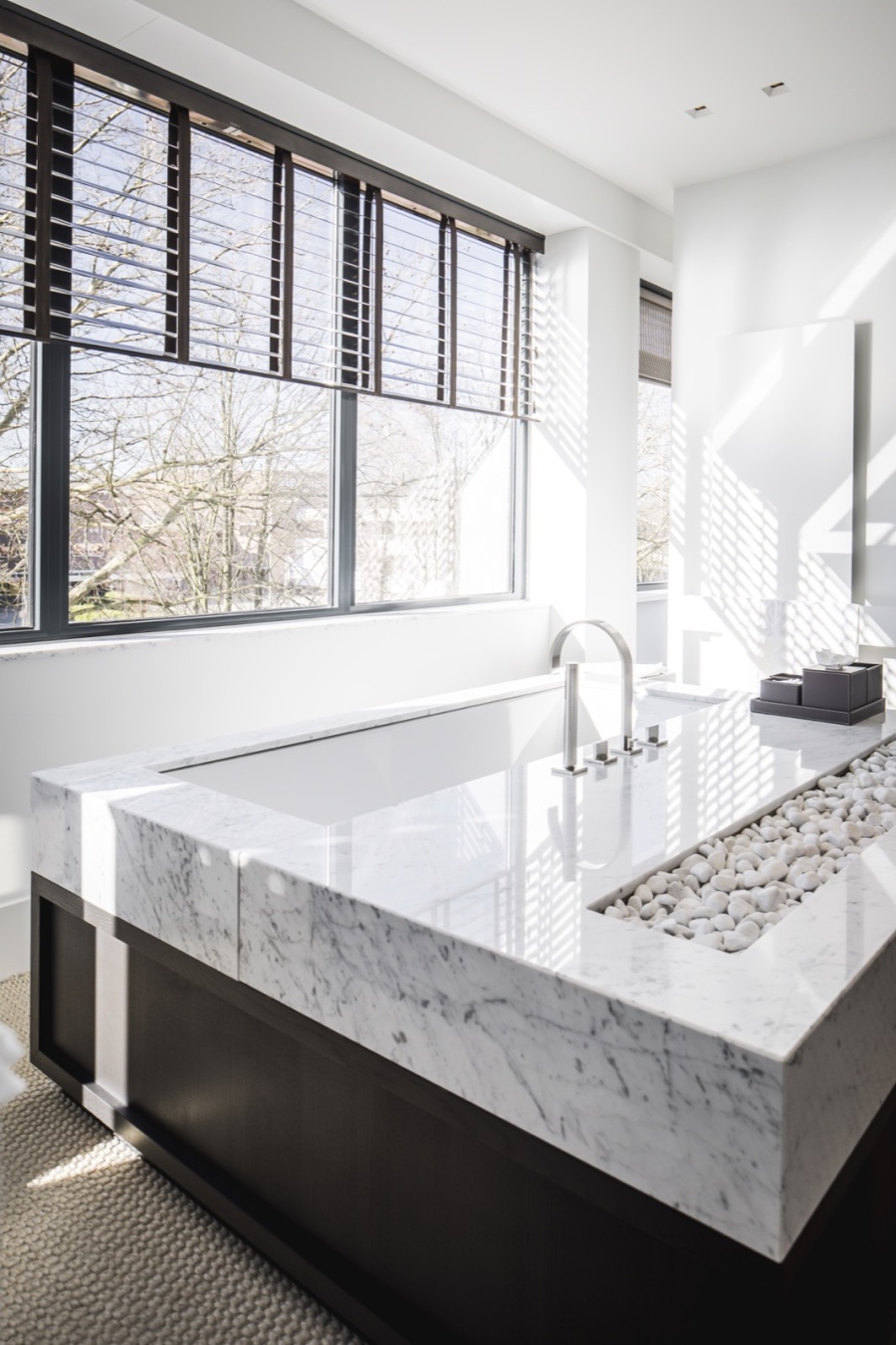 In onze badkamer worden de kranen van Dornbracht's MEM collectie gepresenteerd als elegante elementen die goed samengaan met de natuurlijke materialen in de ruimte. Natuursteen vormt het wastafelmeubel en omhult het ligbad met een tijdloze uitstraling. Elk detail is zorgvuldig gekozen om een gevoel van rust en verfijning te creëren, elke keer dat je deze ruimte betreedt.